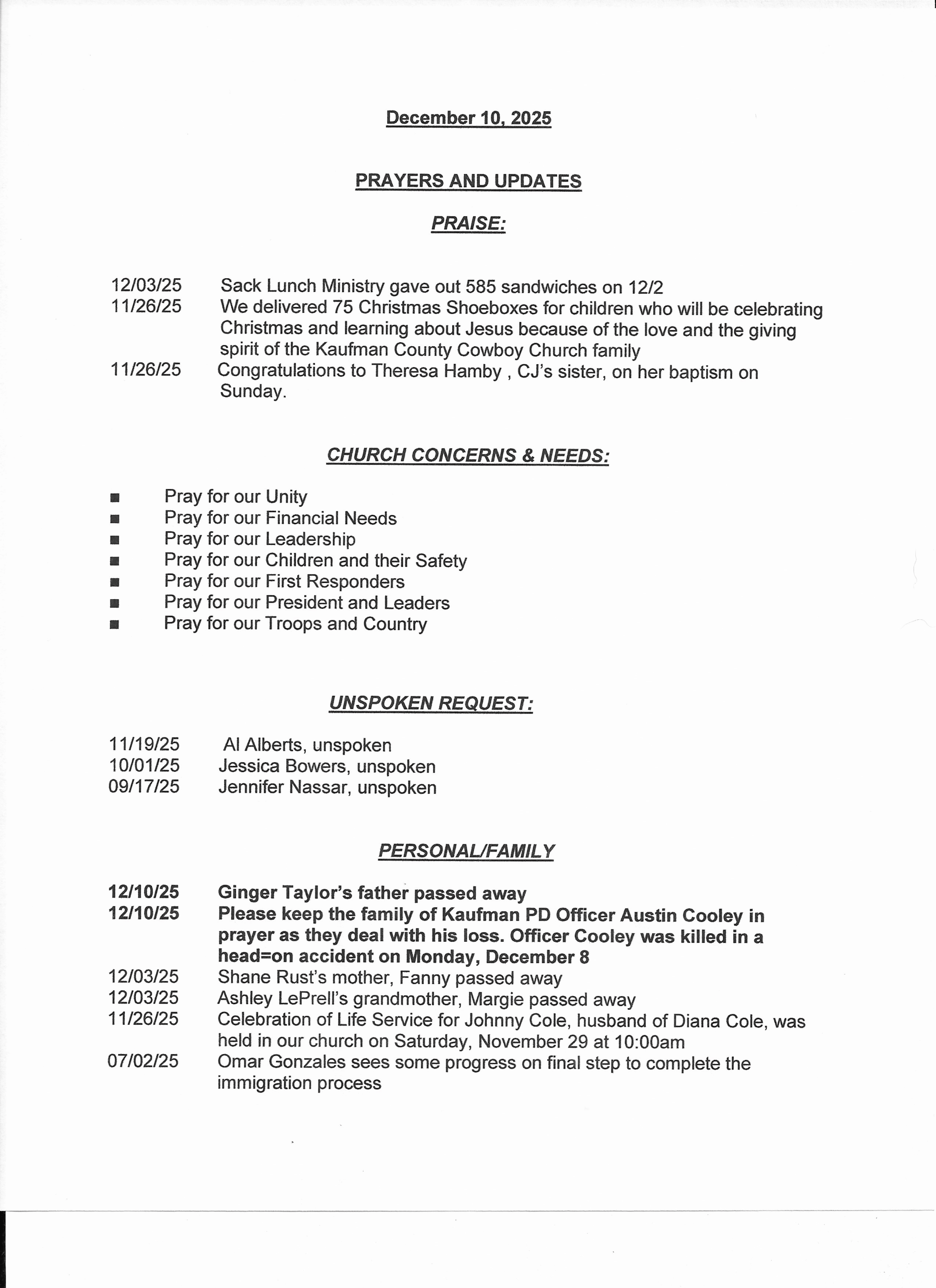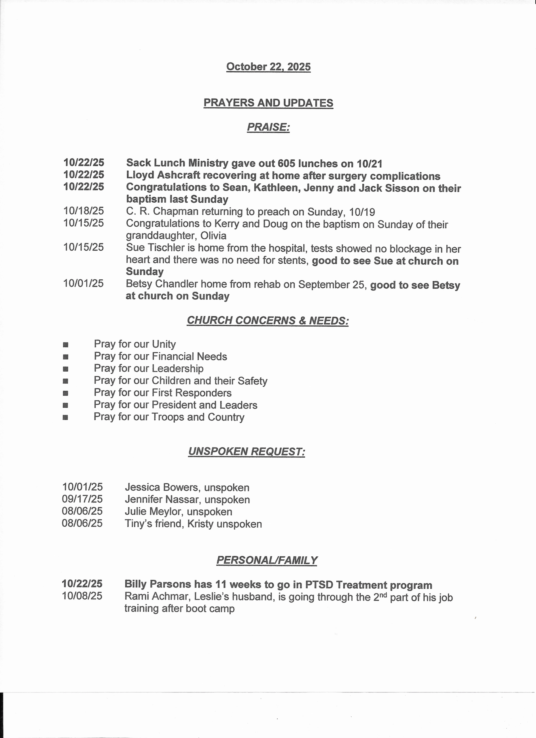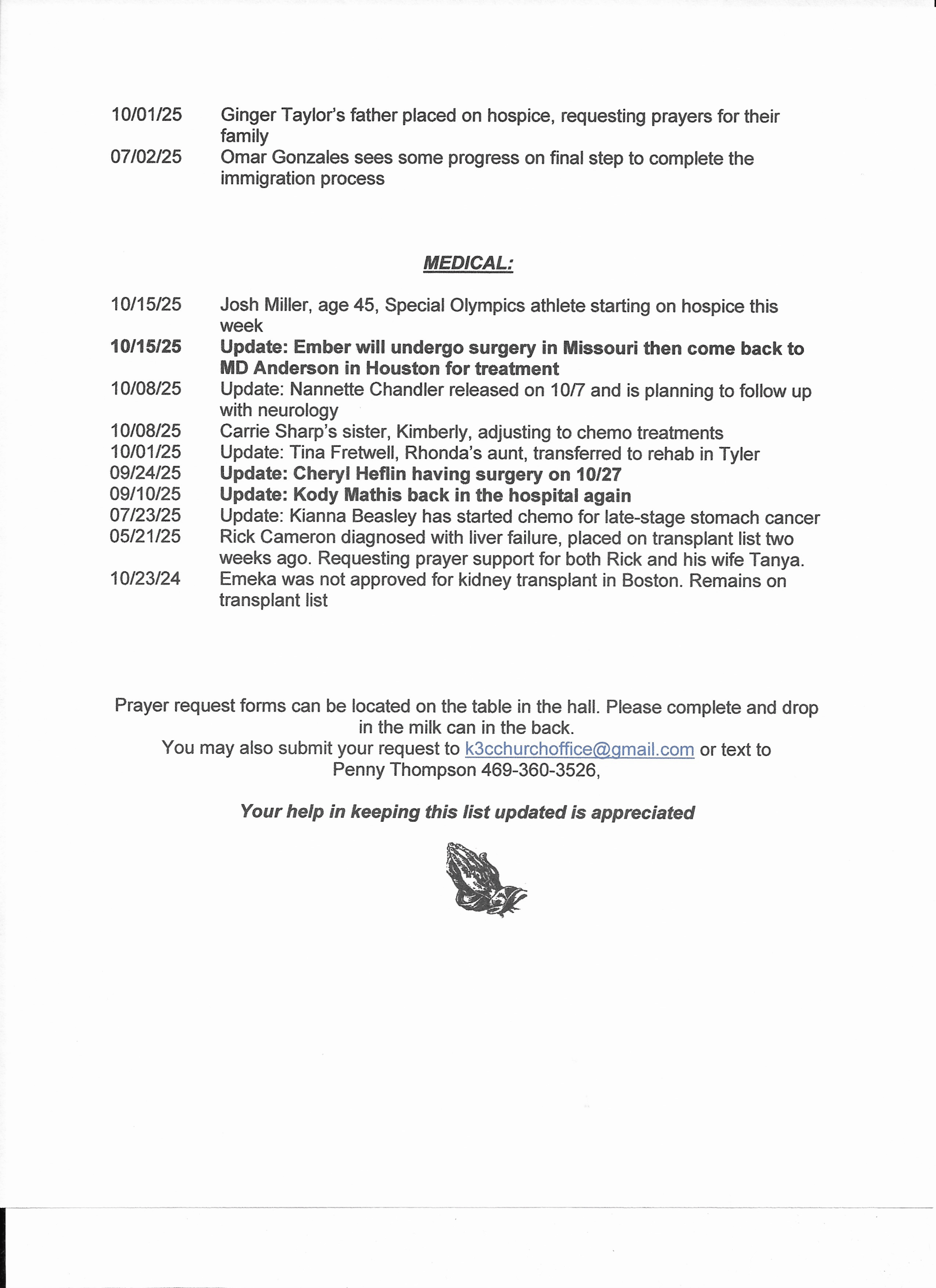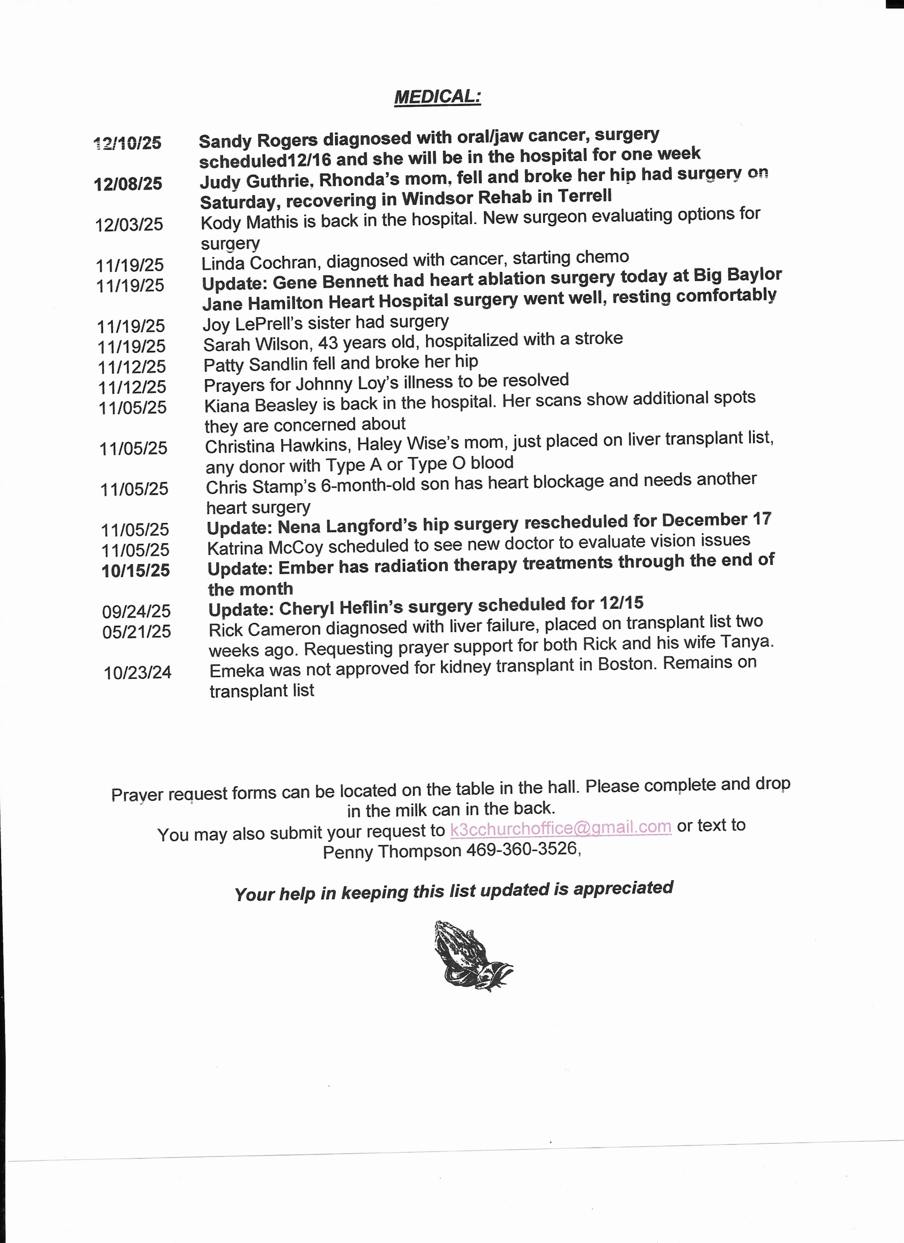 If you would like a copy of the Prayer List, please e-mail