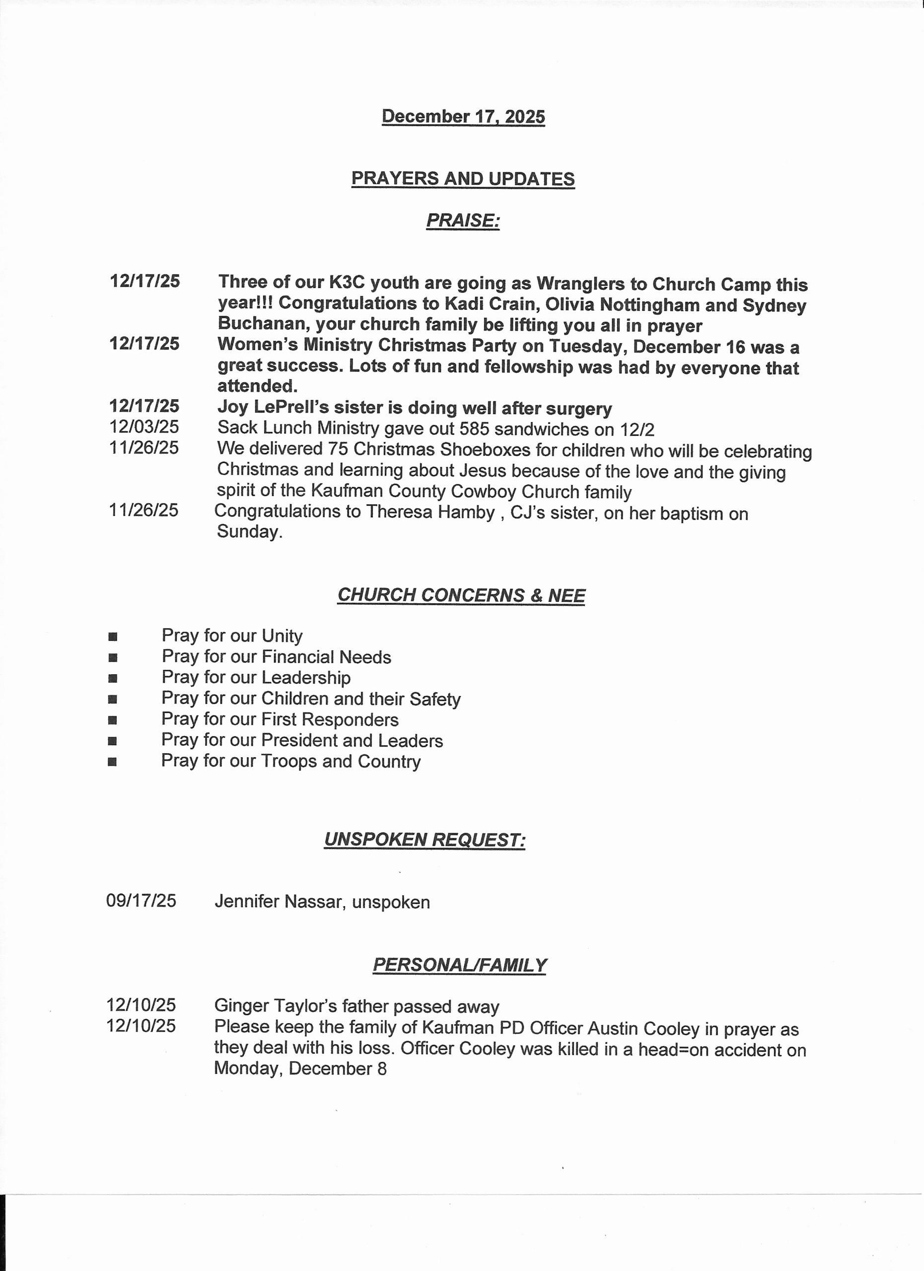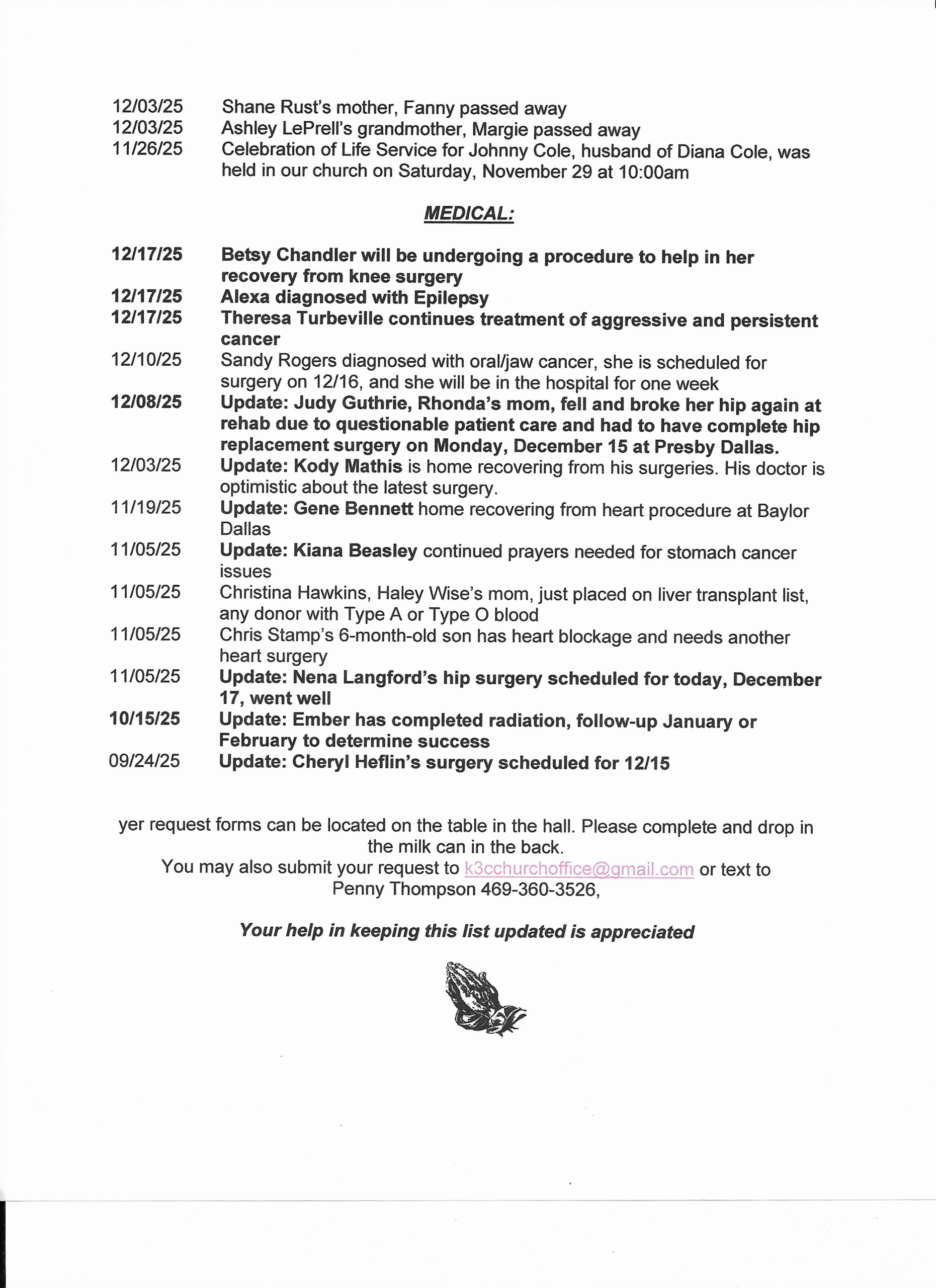 If you would like a copy of the Prayer List, please e-mail